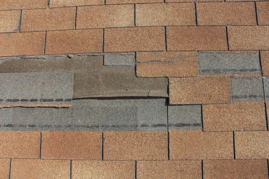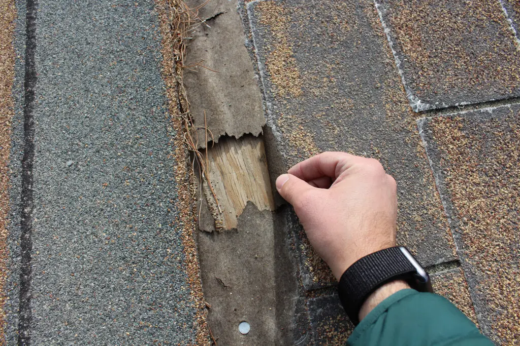 Observed Damage: Numerous asphalt shingles were torn, uplifted, or missing entirely. In several areas, large patches of shingles were absent, leaving plywood decking exposed.
